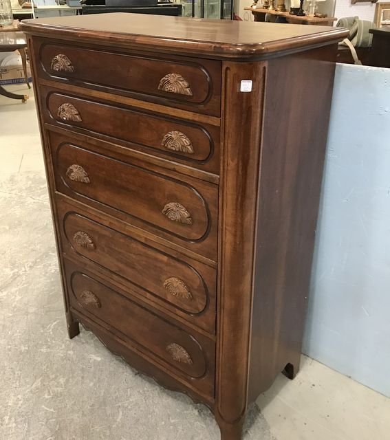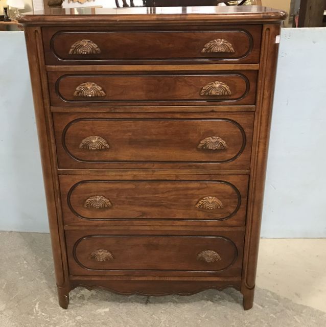 Vintage Victorian Style Chest of Drawers, five drawers, carved wood pulls, cherry, good condition, has one small bad spot on top, 52"h., 37"w., 19"d. Vintage Victorian Style Chest of Drawers, five drawers, carved wood pulls, cherry, good condition, has one small bad spot on top, 52"h., 37"w., 19"d.