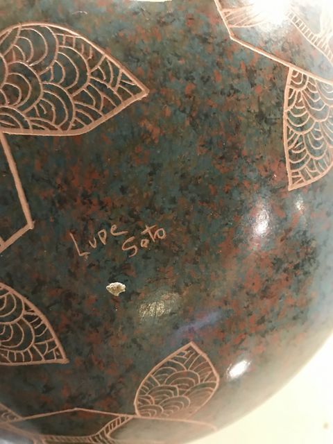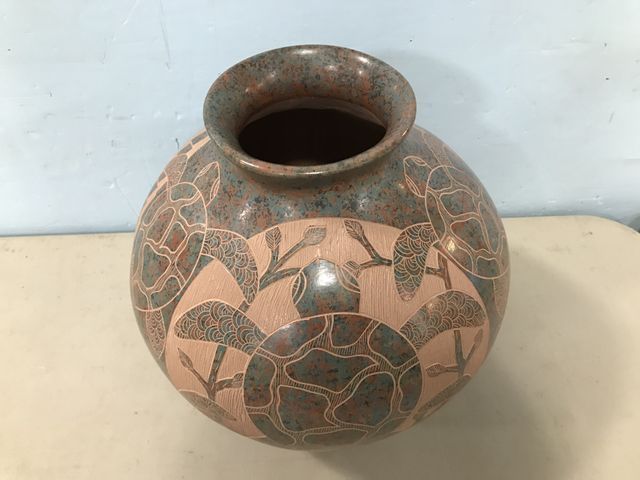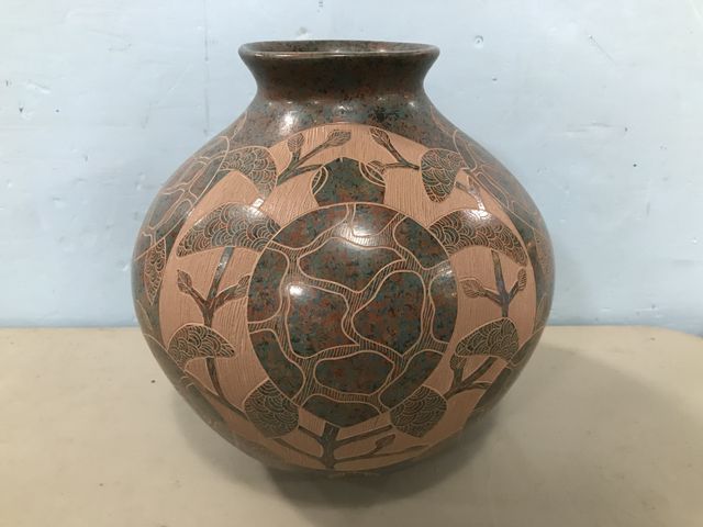 World famous Mata Ortiz pot, hand made by pinching and coil method, geometric designs, hand painted, Olla pot, Turtle image, made for artwork/decor, popular in Santa Fe, NM. signed Lupe Toto, retail is 500.00, 11"h., 10"dia. World famous Mata Ortiz pot, hand made by pinching and coil method, geometric designs, hand painted, Olla pot, Turtle image, made for artwork/decor, popular in Santa Fe, NM. signed Lupe Toto, retail is 500.00, 11"h., 10"dia.
