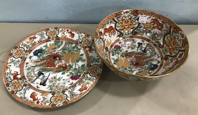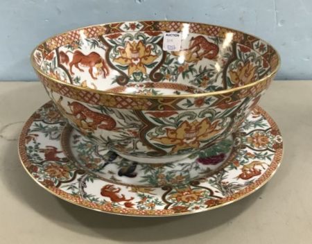 SAJI Japanese Hand Painted Bowl and Under Plate, marked on bottom, hand painted Peacock artwork, porcelain, gold rim trim, 4 1/2"h., 10"dia. bowl. SAJI Japanese Hand Painted Bowl and Under Plate, marked on bottom, hand painted Peacock artwork, porcelain, gold rim trim, 4 1/2"h., 10"dia. bowl.