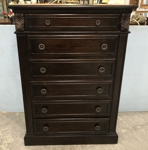New Forest Dark Stain Chest of Drawers, antique reproduction, made in China, six drawers, one needs work, has some scratches, 56"h., 40"w., 18"d. New Forest Dark Stain Chest of Drawers, antique reproduction, made in China, six drawers, one needs work, has some scratches, 56"h., 40"w., 18"d.