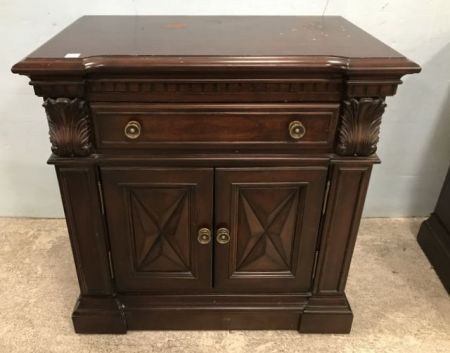 New Forest Dark Stain Night Stand, antique reproduction, made in China, single drawer, double doors, has worn spots on top finish, 30"h., 30"h., 18"d. New Forest Dark Stain Night Stand, antique reproduction, made in China, single drawer, double doors, has worn spots on top finish, 30"h., 30"h., 18"d.