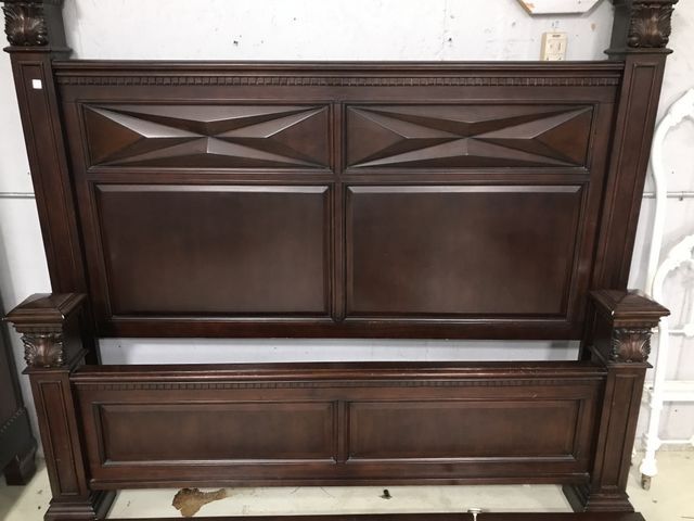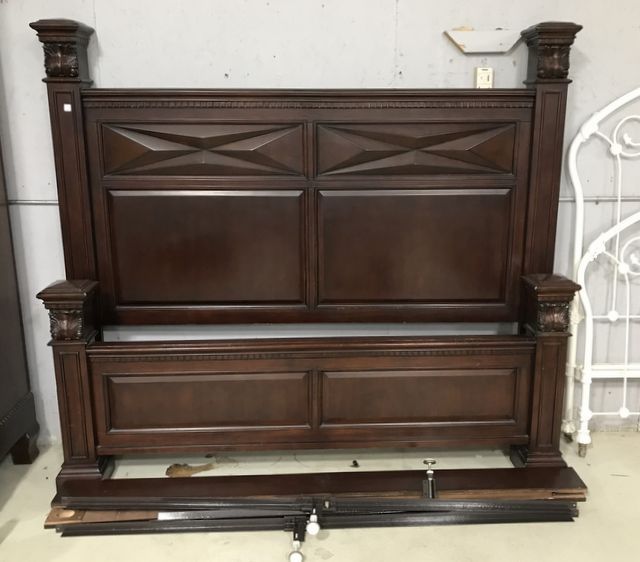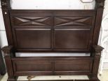 Large New Forest Dark Stain Mini Post Bed, antique reproduction, made in China, King size, has rails, and supports, has finish wear. Large New Forest Dark Stain Mini Post Bed, antique reproduction, made in China, King size, has rails, and supports, has finish wear.