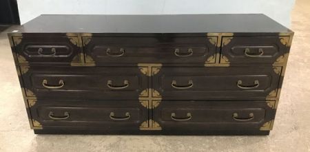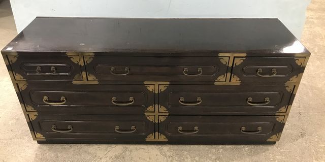 Bernhardt regency Asian style campaign dresser, was the bottom section to a entertainment center, has swirls on lacquer finish, 7 drawers with brass accents, 29"h., 64"w., 19"d Bernhardt regency Asian style campaign dresser, was the bottom section to a entertainment center, has swirls on lacquer finish, 7 drawers with brass accents, 29"h., 64"w., 19"d