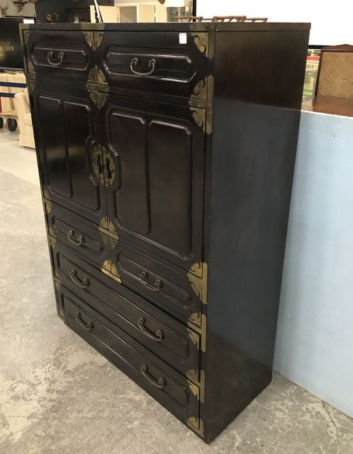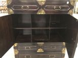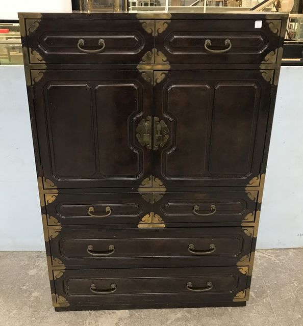 Bernhardt regency chest, Asian style campaign chest, brass accents, four drawers, double door with divided storage, finish has swirls, 58"h., 40"w., 18"d. Bernhardt regency chest, Asian style campaign chest, brass accents, four drawers, double door with divided storage, finish has swirls, 58"h., 40"w., 18"d.