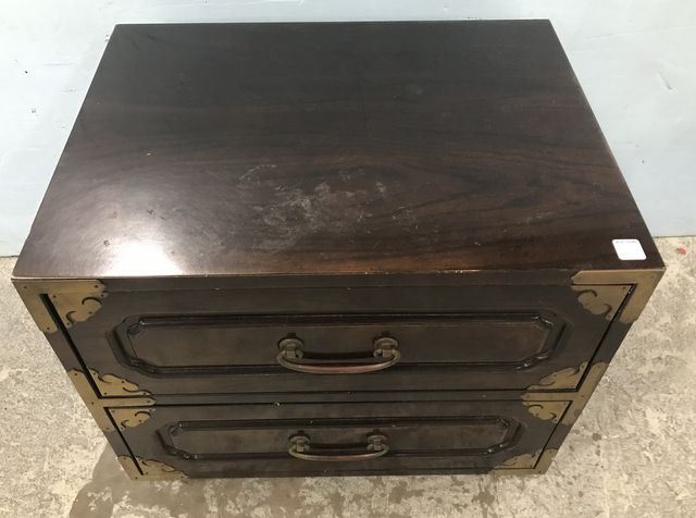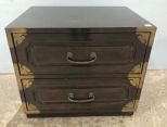 Bernhardt Regency Nightstand, Asian style campaign, brass accents, two drawers, finish has wear, 21"h., 24"w., 18"d. Bernhardt Regency Nightstand, Asian style campaign, brass accents, two drawers, finish has wear, 21"h., 24"w., 18"d.