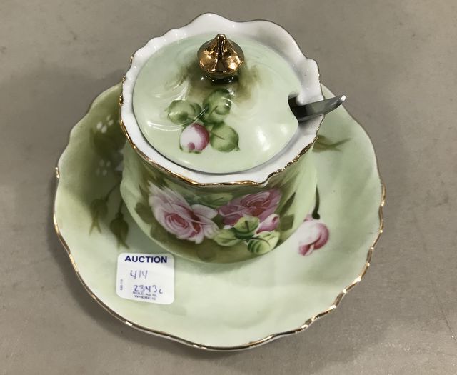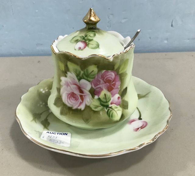 Lefton China Heritage Rose Jelly Jam Jar and Plate, hand painted, with lid and spoon, jar is 3"h., 3"w. Lefton China Heritage Rose Jelly Jam Jar and Plate, hand painted, with lid and spoon, jar is 3"h., 3"w.