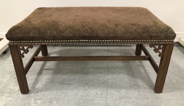 Henredon Chippendale Style Large Bench, bed or window bench, tacked border, upholstered seat, missing one leg trim, 17"h., 36"w., 21"d. Henredon Chippendale Style Large Bench, bed or window bench, tacked border, upholstered seat, missing one leg trim, 17"h., 36"w., 21"d.