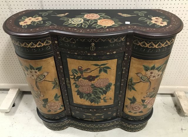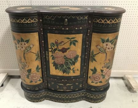 Modern Chinese Wall Console Cabinet, factory painted and designs, carved front, three doors and two drawers, left door needs adjusting, 40"h., 42"w., 13"d. Modern Chinese Wall Console Cabinet, factory painted and designs, carved front, three doors and two drawers, left door needs adjusting, 40"h., 42"w., 13"d.