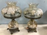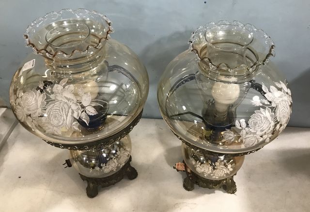 Pair of Yellow Tint Globe Lamps, rose emblems, hurricane shades, brass footed base and frame, 20"h. Pair of Yellow Tint Globe Lamps, rose emblems, hurricane shades, brass footed base and frame, 20"h.