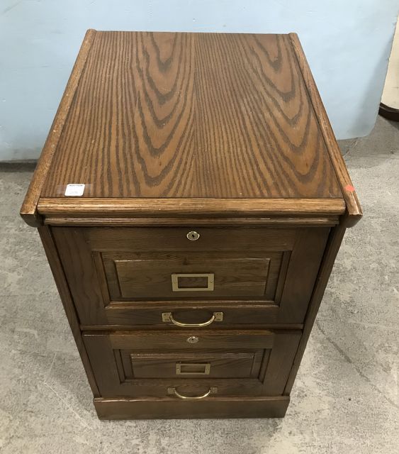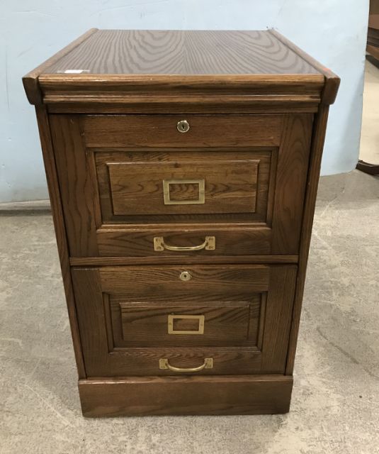 Oak Two Drawer File Cabinet, name plate, brass pulls, has key, 30"h., 19"w., 23"d. Oak Two Drawer File Cabinet, name plate, brass pulls, has key, 30"h., 19"w., 23"d.