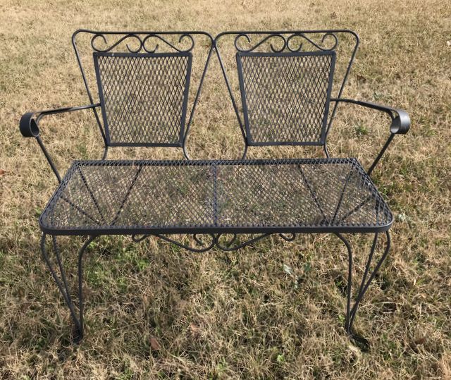Wrought Iron Settee, black painted, arm settee bench, diamond pattern seat. Wrought Iron Settee, black painted, arm settee bench, diamond pattern seat.
