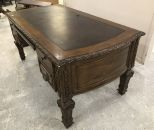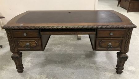 Large Modern executive desk, ornate designs, vinyl top, computer desk, has drawers (need adjusting), legs with removeable, small finish wear, 30"h., 69"w., 36"d. Large Modern executive desk, ornate designs, vinyl top, computer desk, has drawers (need adjusting), legs with removeable, small finish wear, 30"h., 69"w., 36"d.
