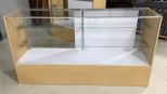 New glass showcase, four glass display shelves, sliding back doors, 38"h., 5'10 long. New glass showcase, four glass display shelves, sliding back doors, 38"h., 5'10 long.