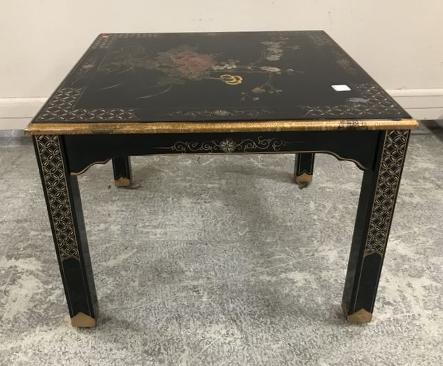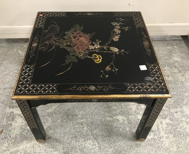 Oriental Black Lacquer Small Table, hand painted black with gold inlaid painted floral, 16"h., 22"w. Oriental Black Lacquer Small Table, hand painted black with gold inlaid painted floral, 16"h., 22"w.