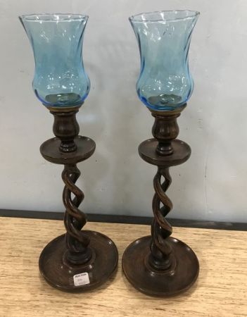 Pair of Barley Twist Candle Stands, light blue glass shades, 17"h. Pair of Barley Twist Candle Stands, light blue glass shades, 17"h.