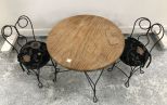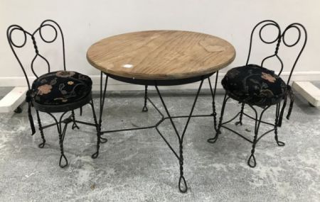 Child's Ice Cream Table and Chair Set, two iron child's chairs, iron base wood top child's ice cream table, 19"h., 24"dia. Child's Ice Cream Table and Chair Set, two iron child's chairs, iron base wood top child's ice cream table, 19"h., 24"dia.