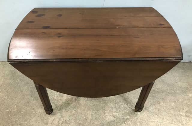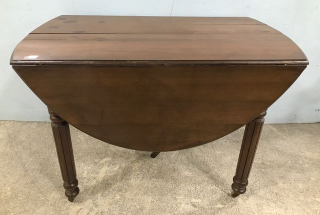 Vintage Drop Leaf Kitchen Table, on wheels, two side leaves, open is oval, three center leaves, top has a split, 28"h., 44"d. Vintage Drop Leaf Kitchen Table, on wheels, two side leaves, open is oval, three center leaves, top has a split, 28"h., 44"d.