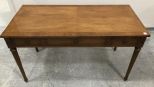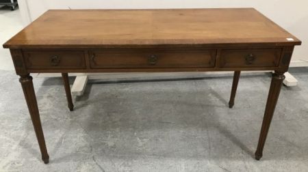 Hammary French Style Writing Desk, three drawers, Louis XVI style legs, needs tightening, has finish wear, scuffs, scratches, 29"h., 52"w., 24"d. Hammary French Style Writing Desk, three drawers, Louis XVI style legs, needs tightening, has finish wear, scuffs, scratches, 29"h., 52"w., 24"d.
