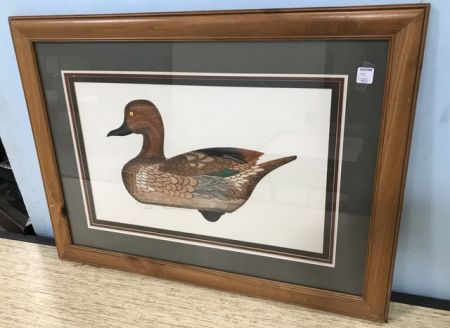 Green Wing Teal Hen Decoy Lithograph Signed, numbered 61/150, Nichlos, Conn. 1965, framed, 24"h., 32"w. Green Wing Teal Hen Decoy Lithograph Signed, numbered 61/150, Nichlos, Conn. 1965, framed, 24"h., 32"w.