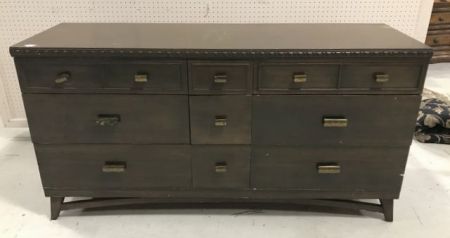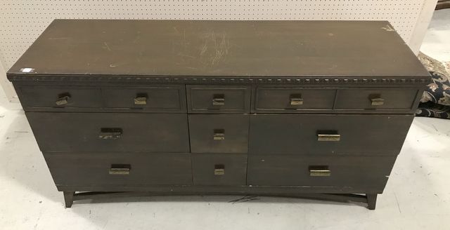 Vintage Mid Century Style Double Dresser, 9 drawer, finish has scratches and scuffs, has front top border trim, 32"h., 62"w., 19"d. Vintage Mid Century Style Double Dresser, 9 drawer, finish has scratches and scuffs, has front top border trim, 32"h., 62"w., 19"d.