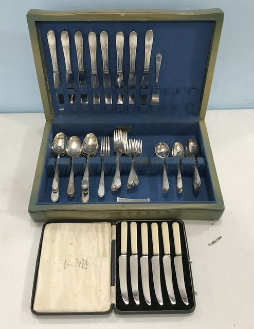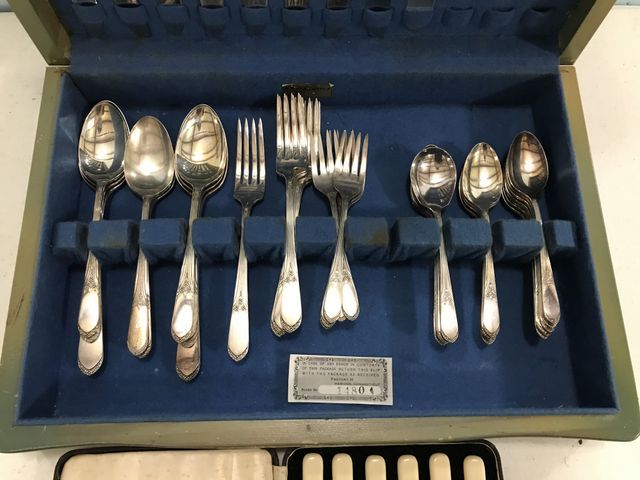 W & M Rogers silver plate flatware, 8 knives, butter knife, 15 spoons, 11 forks, 10 spoons in box, Devonshire aka. Mary Lou 1938, Sheffield "My Lady" butter knives. W & M Rogers silver plate flatware, 8 knives, butter knife, 15 spoons, 11 forks, 10 spoons in box, Devonshire aka. Mary Lou 1938, Sheffield "My Lady" butter knives.