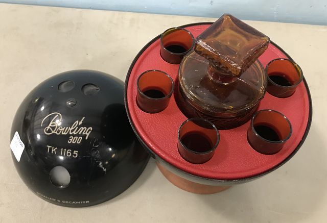 Bowling TK 1165 Bowler's Decanter, plastic case, decanter with 5 plastic cups, 9"h. Bowling TK 1165 Bowler's Decanter, plastic case, decanter with 5 plastic cups, 9"h.