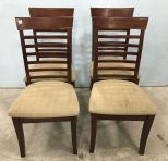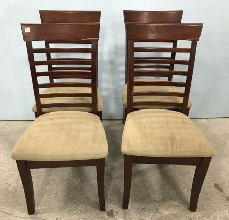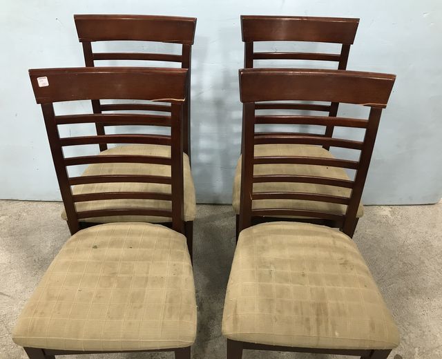 Modern cherry dinning table, made in Malaysia, tops on head rests have cracks, cushions are stained. Modern cherry dinning table, made in Malaysia, tops on head rests have cracks, cushions are stained.