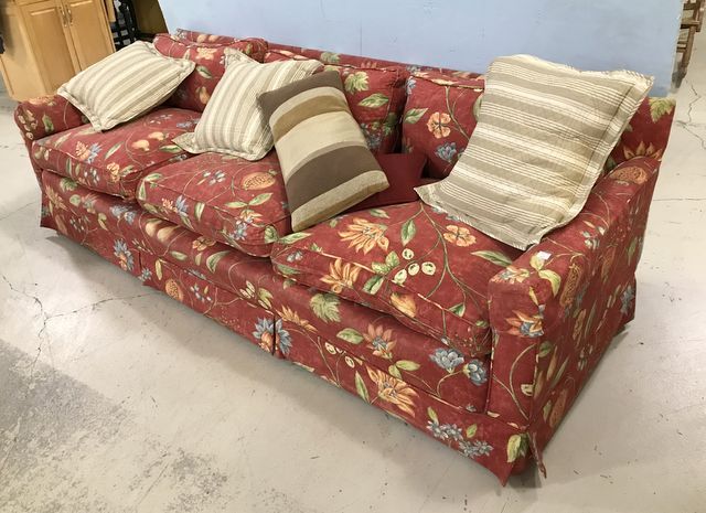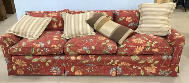 Red Upholstered Three Cushion Sofa, floral pattern, 28"h., 7'7 long. Red Upholstered Three Cushion Sofa, floral pattern, 28"h., 7'7 long.