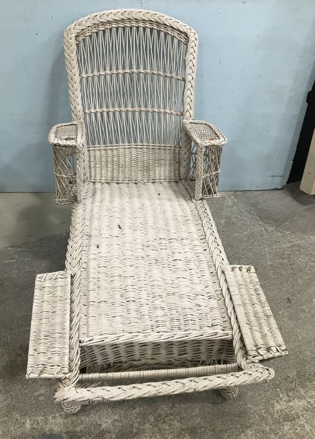 Vintage White Wicker Lounger, arms with drink holders, age wear, 43"h., 71"L. Vintage White Wicker Lounger, arms with drink holders, age wear, 43"h., 71"L.