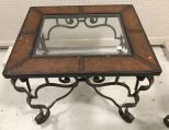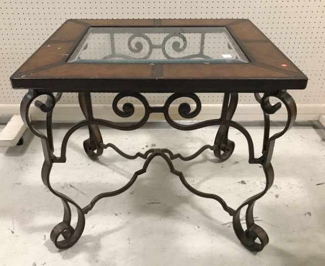 Modern iron base side table, faux leather top ( has wear) and glass insert, heavy, 27"h., 30"w. Modern iron base side table, faux leather top ( has wear) and glass insert, heavy, 27"h., 30"w.