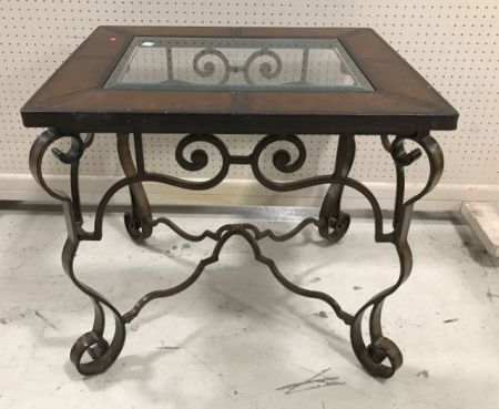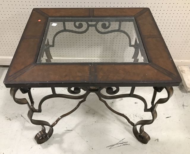 Modern iron base side table, faux leather top ( has wear) and glass insert, heavy, 27"h., 30"w. Modern iron base side table, faux leather top ( has wear) and glass insert, heavy, 27"h., 30"w.