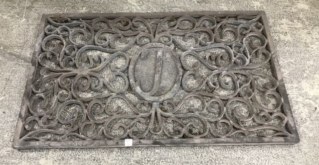 Vintage Metal Entrance Way Mat, Initial J, ornate, outside wear, 39"w., 24"d. Vintage Metal Entrance Way Mat, Initial J, ornate, outside wear, 39"w., 24"d.