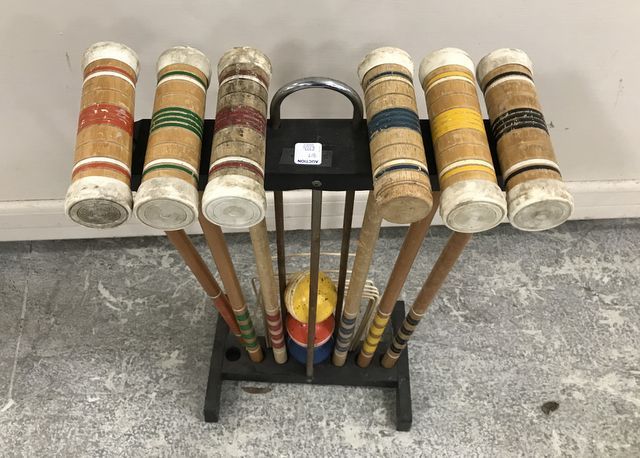 Croquet Mallet Hoop Ball Set, lawn game, 6 mallets, ball, with stand. Croquet Mallet Hoop Ball Set, lawn game, 6 mallets, ball, with stand.