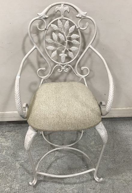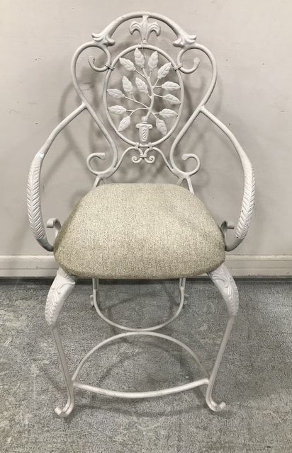 White Painted Ornate Arm Bar Stool, tree and leaf design, cushion seat, 42"h. White Painted Ornate Arm Bar Stool, tree and leaf design, cushion seat, 42"h.