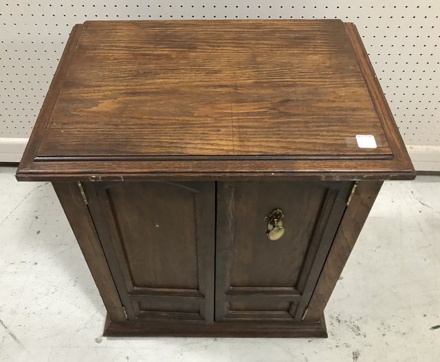 Vintage Small Double Door Commode, missing one pull, and inner shelf, has finish wear, 26"h., 22"w. Vintage Small Double Door Commode, missing one pull, and inner shelf, has finish wear, 26"h., 22"w.