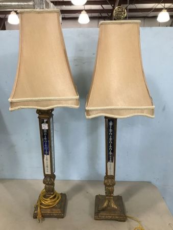 Pair of Modern Gold Gilt Mirrored Table Lamps, etched glass mirror, 36"h. Pair of Modern Gold Gilt Mirrored Table Lamps, etched glass mirror, 36"h.
