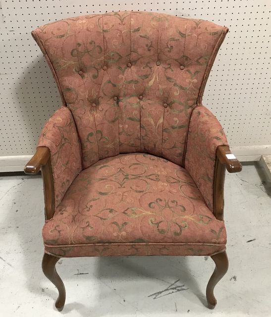Upholstered French Style Arm Chair, clean fabric, arm and legs have wear spots, 35"h. Upholstered French Style Arm Chair, clean fabric, arm and legs have wear spots, 35"h.