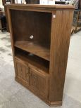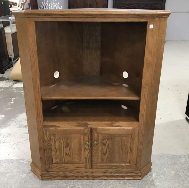 Eagle Company Oak Corner TV Cabinet, modern piece, double door storage, tv shelf, good shape, 57"h., 46"w., 25"d. Eagle Company Oak Corner TV Cabinet, modern piece, double door storage, tv shelf, good shape, 57"h., 46"w., 25"d.
