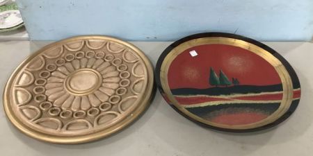 Two modern large decorative chargers, 20"dia gold painted and glass painted landscape scene. Two modern large decorative chargers, 20"dia gold painted and glass painted landscape scene.