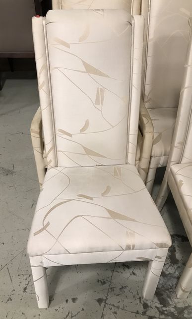 Six Full Upholstered Dinning Chairs, four sides, two arms, has worn areas in fabric, needs cleaning, 42"h. Six Full Upholstered Dinning Chairs, four sides, two arms, has worn areas in fabric, needs cleaning, 42"h.