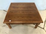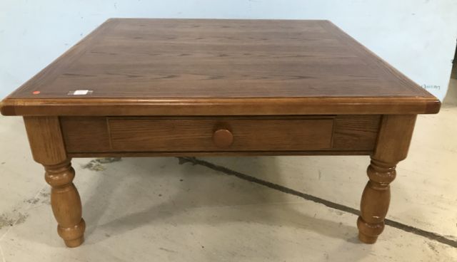 Square oak coffee table, single drawer, modern piece, 16"h., 36"w. Square oak coffee table, single drawer, modern piece, 16"h., 36"w.