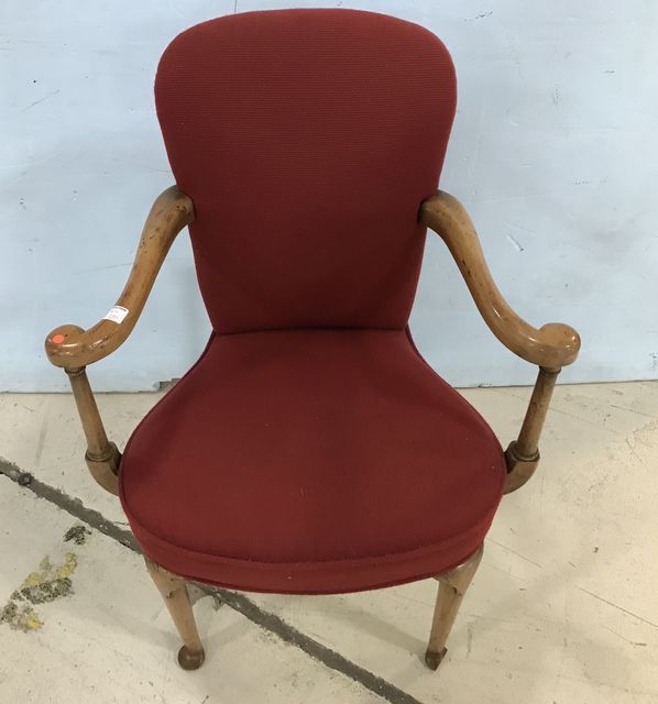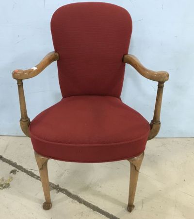 Modern Queen Anne Arm Chair, red upholstered, arm needs work, 35"h. Modern Queen Anne Arm Chair, red upholstered, arm needs work, 35"h.
