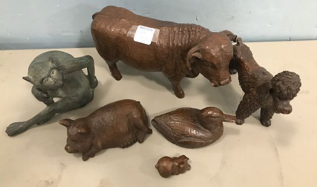 Resin Faux Wood Carved Animals, Poodle, pigs, duck, Bull 5"h., 9"w., metal monkey figure. Resin Faux Wood Carved Animals, Poodle, pigs, duck, Bull 5"h., 9"w., metal monkey figure.
