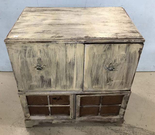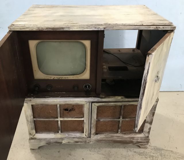 Vintage RCA Tv Cabinet, painted white, needs work, 35"h., 33"w., 21"d. Vintage RCA Tv Cabinet, painted white, needs work, 35"h., 33"w., 21"d.