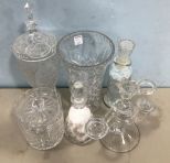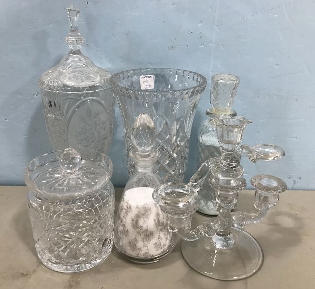 Glass two arm candle holder, two jars, pressed glass covered urn, biscuit jar, footed bowl. Glass two arm candle holder, two jars, pressed glass covered urn, biscuit jar, footed bowl.