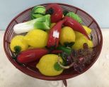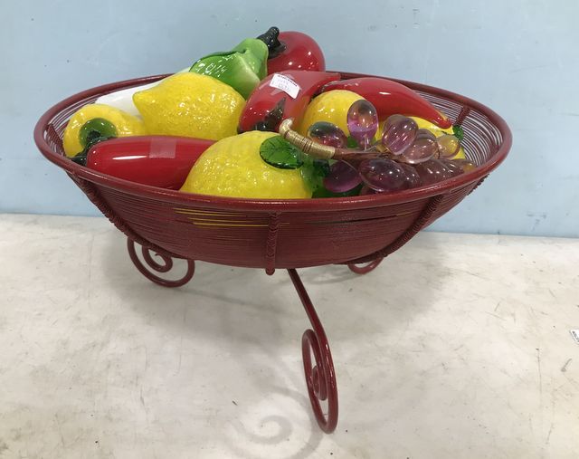 Moder Decor Red Wire Basket with 28 Glass Fruits, 10"h., 18"dia. Moder Decor Red Wire Basket with 28 Glass Fruits, 10"h., 18"dia.