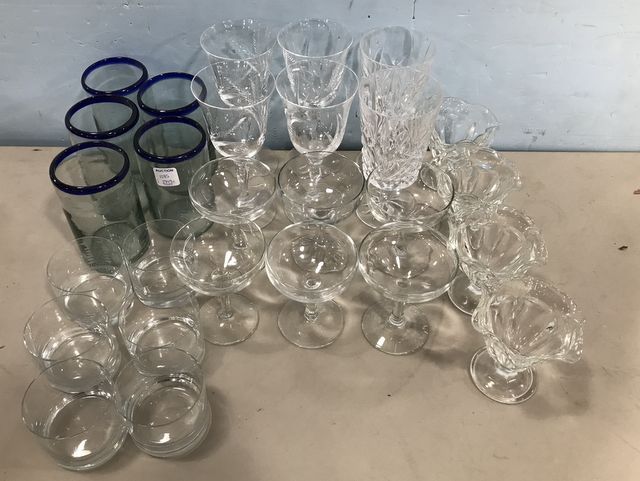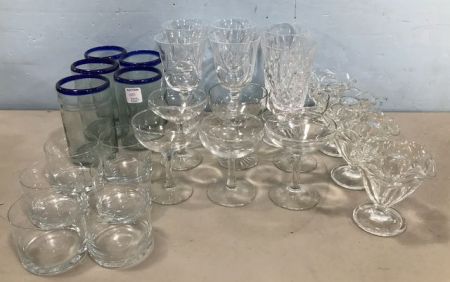 Assorted Group of Clear Glass Cups, stemware, sherbets, blue rim cups. Assorted Group of Clear Glass Cups, stemware, sherbets, blue rim cups.