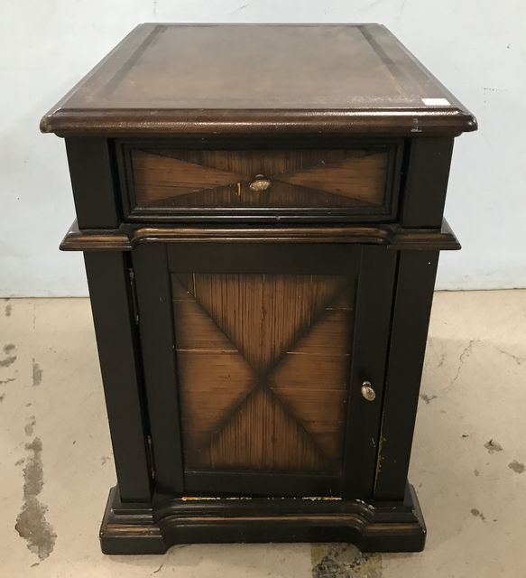 Modern Black Painted Nightstand, faux leather top, single drawer, single door, 25"h., 18"w. 32"d. Modern Black Painted Nightstand, faux leather top, single drawer, single door, 25"h., 18"w. 32"d.