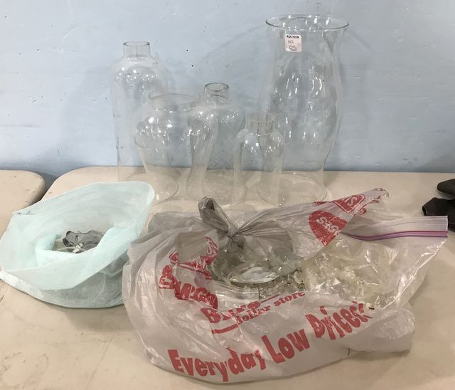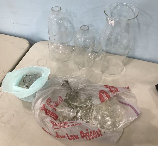 Hurricane shade 12"h., etched glass candle shades, assorted collection of glass prisms and candle parts. Hurricane shade 12"h., etched glass candle shades, assorted collection of glass prisms and candle parts.