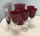 Ruby red stemware, pink jar container, 3 gray wine glasses. Ruby red stemware, pink jar container, 3 gray wine glasses.